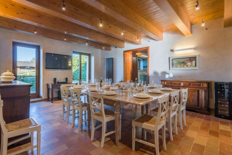 The farmhouse is set on two levels: the ground floor consists of a large living room with two dining areas, a kitchen, a toilet with laundry area and a double bedroom with en suite bathroom with shower suitable for disabled people. On the first floor there are six double bedrooms each of them with private bathroom with shower, except for one bedroom that has a bathroom with shower and bathtub.