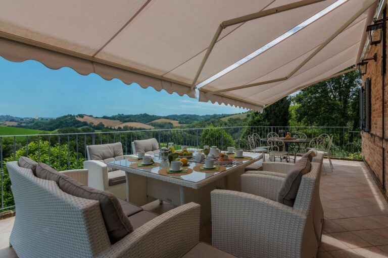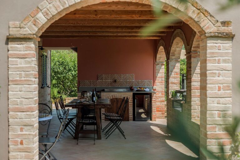 ACCOMMODATION FACILITIES – Villa Mariana is a charming private villa with swimming pool in Le Marche region located in Belmonte Piceno, a small historic town in the province of Fermo, halfway between the Sibillini Mountains and the Adriatic coast. The closest beaches are those of Porto San Giorgio and Pedaso, which can be easily reached in about 30 minutes driving. Perfect for families or groups of friends thanks to its large spaces, the villa is located in a quiet and scenic setting with a magnificent view over the hills of Le Marche countryside. The property is completely fenced-in and offers a swimming pool with Roman steps entrance, fitness room, Mediterranean garden with orchard and play areas. At the guests’ disposal for alfresco dining a large porch equipped with outdoor kitchen and Argentinian barbecue, panoramic terrace and shaded areas to enjoy days of relaxation and well-being.