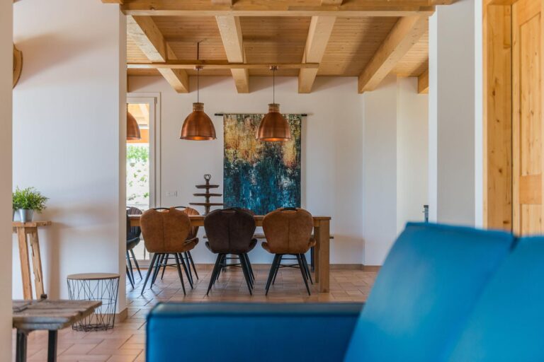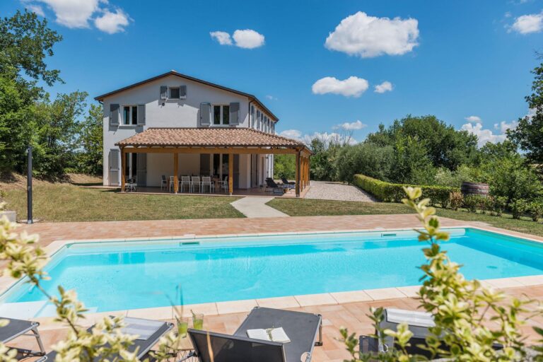 PRIVATE STRUCTURE (RENT ONLY) – Surrounded by the rolling hills of Sant’Angelo in Pontano in Le Marche, with panoramic views stretching as far as the Sibillini Mountains, Villa Teresa offers a unique accommodation experience. This property consists of two side-by-side houses that can be rented together, making it the perfect choice for families or groups of friends seeking both privacy and togetherness. The center of Sant’Angelo in Pontano is just a few minutes away, making the villa an ideal base for exploring the village and fully experiencing the authentic charm of the region. Among the must-see destinations in the area are Lake Fiastra, known for its natural landscapes and hiking trails, the historic city of Fermo, the beaches of Porto San Giorgio and the lively town of Civitanova Marche, renowned for shopping and seaside nightlife. Protected by trees and lush vegetation, the setting is peaceful and designed for larger groups. The private pool, nestled between the two houses, is the heart of the property and can be accessed via a pathway from one house or a short staircase from the other. Both houses feature spacious living areas decorated in a contemporary and functional style. The well-equipped kitchens open onto covered porches with tables and chairs, perfect for cooking together and turning every meal into a convivial experience in close contact with nature.