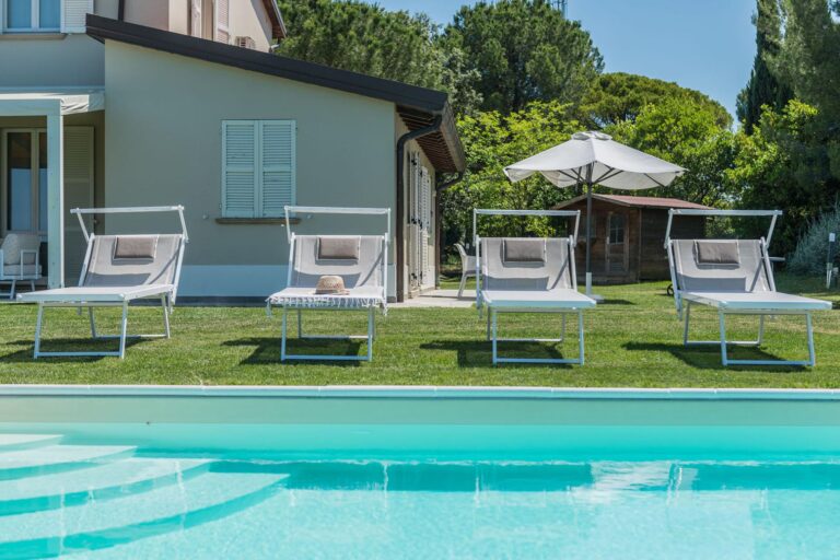 PRIVATE STRUCTURE (RENT ONLY) – Surrounded by greenery and located just 4 km from the Adriatic coast, Villa Selene is a holiday home with private pool and sea view in Pesaro. The partially fenced property extends over a large garden with olive and fruit trees, where you’ll find a beautiful saltwater pool with Roman-style steps — perfect for cooling off on warm summer days. A furnished porch invites you to enjoy lunches and dinners outdoors, with a barbecue ready for delicious grilled meals and a fire pit that sets the mood for evenings spent chatting under the starry sky. For moments of fun with family or friends, there’s also a table tennis available. The villa is an excellent starting point for exploring the area: from the beaches of Pesaro to the wild coastline of Fiorenzuola di Focara, with stops at the many local fish restaurants and on to historic villages such as Gradara, the art city of Urbino and the Republic of San Marino. In every season, Villa Selene captures the authentic atmosphere and colors of Le Marche countryside, just a short distance from the sea.